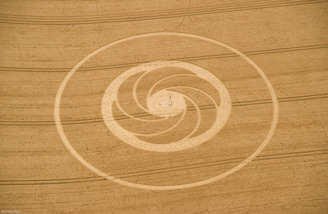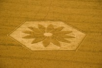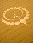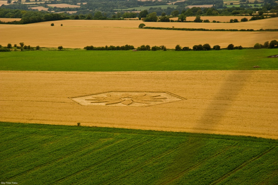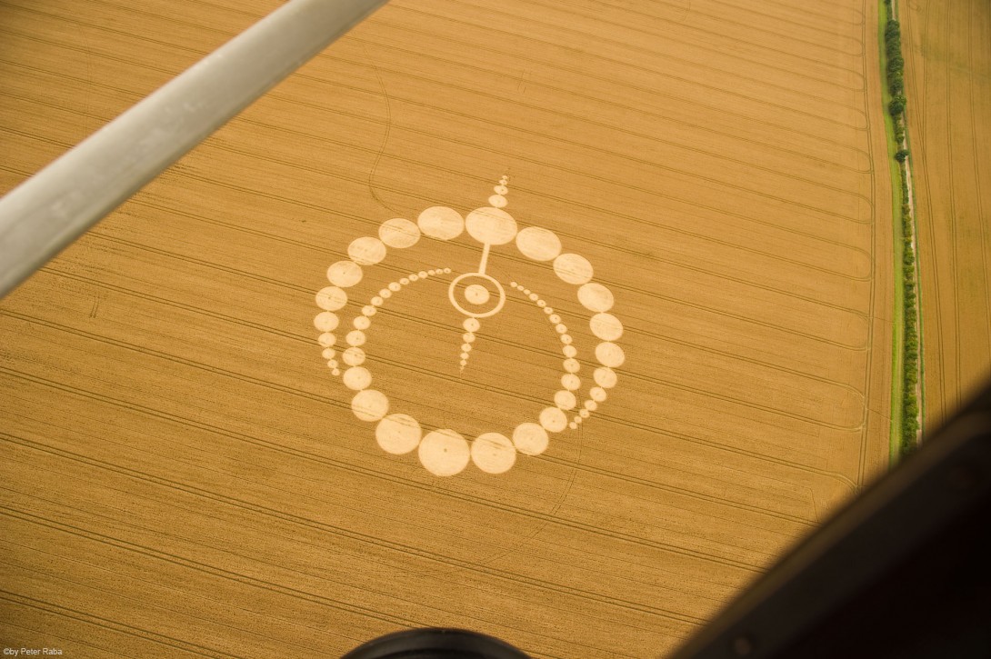 Schon kurz nach dem Start zeigt sich ein erster Kornkreis, wie man ihn in seiner exakten Form vom Boden aus nicht erkennen kann geschweige denn, selbst je in dieser Genauigkeit gestalten könnte. Vor allem drei Merkmale fallen auf: 1. Mathematische Präzision nach den Prinzipien der Heiligen Geometrie bzw. des Goldenen Schnitts; 2. Botschaftscharakter der Prägungen in symbolischer Gestalt; 3. Durch Augenzeugen belegte Informationsübermittlung der formgebenden Matrix via „plasmatischer Energie“ in Sekundenschnelle.
