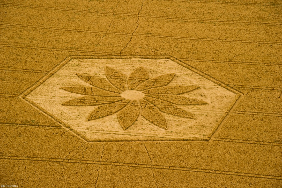 Als wir näher kommen, enthüllt sich die vollendete Formgebung dieser zwölfblättrigen Blüte. Der Kreis ist am 17. Juli 2012 bei Juggler’s Lane nahe Yatesbury erstmals gesichtet worden.