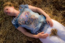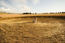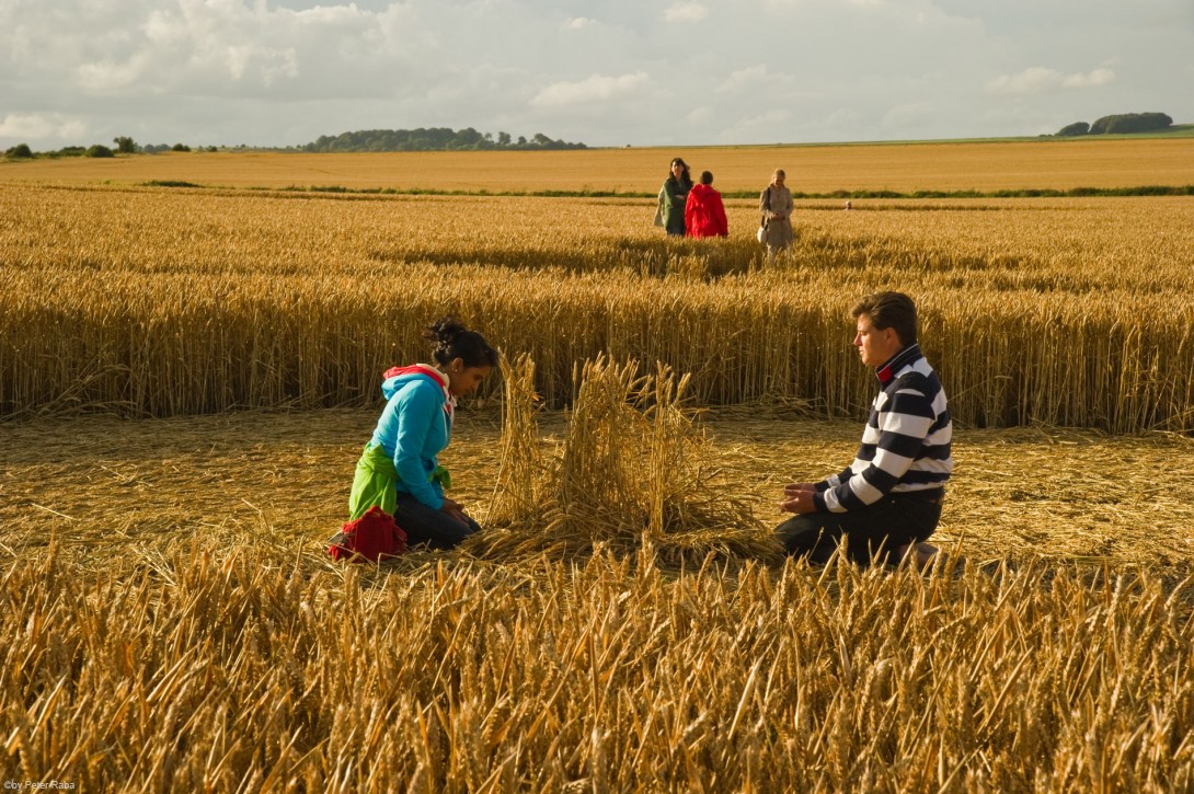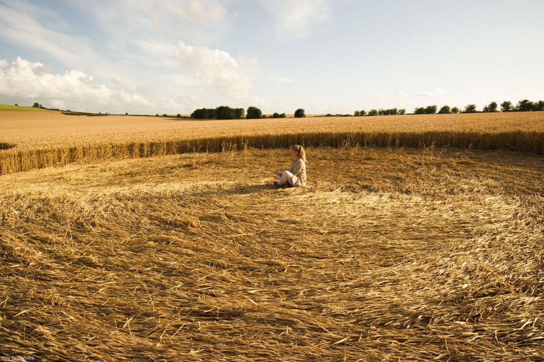 Mona Haase-Raba im Zentrum eines der großen Randkreise. – Wer sich in sein eigenes Inneres versenkt, kann sie spüren, die über dem Feld liegende energetische Ausstrahlung. Es ist eine sehr sanfte, weich machende Schwingung. Man könnte sich durchaus vorstellen, daß sich die aufgeprägte Information der hier dargestellten Vereinigung von Himmel und Erde den Menschen mitteilt, nachdem sie das Brot gegessen haben das aus diesem Getreide hergestellt wird.