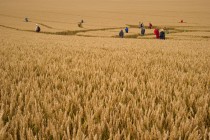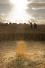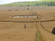 Von einer kleinen Anhöhe aus photographierte Mona dieses Bild des gleichen Kreises, in dem inzwischen viele Neuankömmlinge Platz genommen haben. Der im Kreisinneren herrschende Fluß der Energie wird offensichtlich genossen, da diese Formation durch Feldbegehung nur durch mühevollen Anmarsch zu erreichen ist. – Bei den hier senkrecht den Kreis durchkreuzenden Pfaden handelt es sich übrigens um Traktorspuren, die der Bauer schon gesetzt hat, bevor der Kreis entstand.