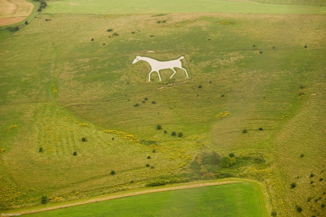 Eine Luftaufnahme des weißen Pferdes am Milk Hill, der seinen Namen wohl wegen des weißen Kalkgesteins erhalten hat, aus dem er in der Hauptsache aufgebaut ist.Â