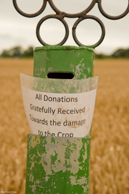 Der Bauer hat eine Spendenbox aufgestellt: „Jede Gabe wird dankbar entgegen genommen, um entstandene Schäden am Korn aufzuwiegen.“ So kann man es auch machen.Â
