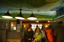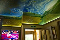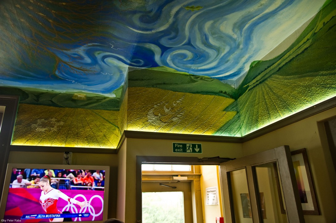 Teilansicht des Deckengemäldes über dem Eingang des Barge Inn. Ein kurioser Gegensatz zu diesem Gemälde mit seinen teilweise überirdischen Aspekten: der Fernsehschirm links unten im Bild mit der Life-Übertragung des Bodenturnens während der Olympischen Sommerspiele 2012 in London.Â