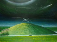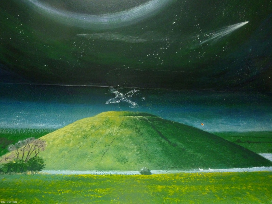 Eine malerische Darstellung dieses Tumulus im Barge Inn, das sich inzwischen zu einem Treffpunkt von Kornkreisforschern gemausert hat. Der Vogel über dem Hügel symbolisiert – wie Eingeweihte zu wissen glauben – die seit Jahrtausenden bestehende Verbindung zu den Sirianern, sowie deren häufige Besuche unserer Erde.Â