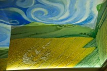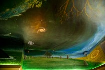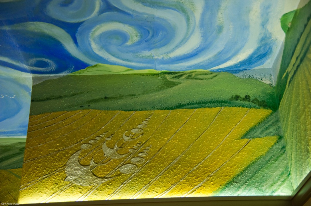 Das Deckengemälde geht an vielen Stellen auf die Wände über und wird mit Darstellungen von Kornkreisen fortgesetzt. Hier die Ansicht eines berühmt gewordenen Gebildes aus dem Jahr 2003 bei Alton Barnes unterhalb des Weißen Pferdes am Milk Hill. Es wird meist als „der Schwalbenschwarm“ – bisweilen auch als „Ampel“ bezeichnet.Â