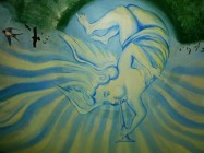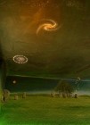 Auch hier wieder das Urprinzip der rotierenden Spirale mit ihren Fraktalen, wie es uns über die Beobachtung der Galaxien vom Anbeginn der Entwicklung astronomischer Teleskope vor Augen geführt wurde. Das originale Kornkreismuster wurde bereits am 7. Juli 1996 mit mathematisch exakter Darstellung nach den Regeln des Goldenen Schnitts in ein Feld bei Stonehenge geprägt, so wie es auf diesem Gemälde dargestellt ist. Â