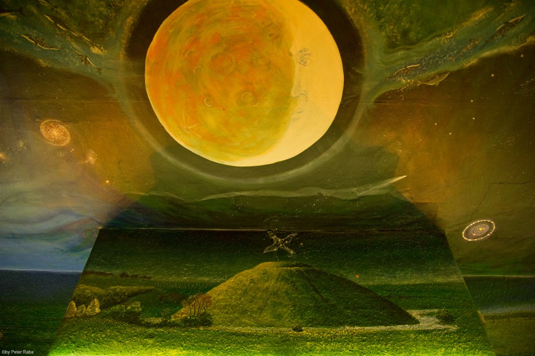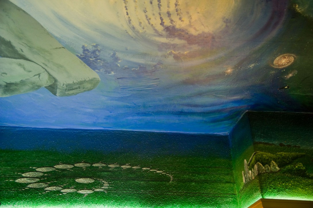 Sonnenaufgang über Stonehenge als Teil des groß angelegten Decken- und Wandgemäldes im Gasthaus Barge Inn, das inzwischen neben dem sog. Silent Circle ein Haupttreffpunkt der „Croppies“ geworden ist, – wie die ernsthaften Kornkreisforscher sowohl wie die darüber hinaus etwas „Ver-rückten“ genannt werden.