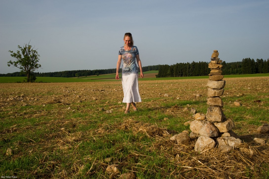 Vereinzelt konnten wir noch Ähren auflesen und verleibten uns ein paar Körner davon ein. Auch Mona überließ sich für einige Zeit willig der „Weichmacher-Kraft“, die dem Erdreich zu entströmen schien. Selbst wenn der Kreis inzwischen nicht mehr sichtbar ist, so hatte die prägende Matrix doch spürbar das Erdreich mit ihrer Information getränkt.Â